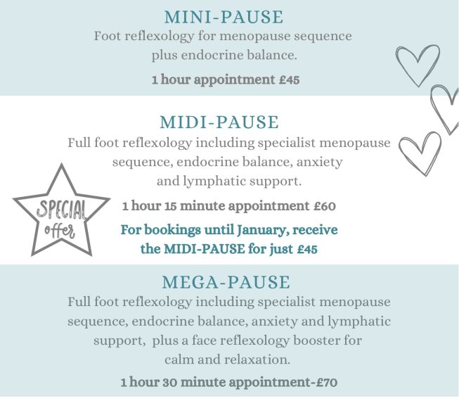 My Reflexology for Menopause treatments are designed to gently support women experiencing a range of symptoms, including temperature regulation challenges, low mood, anxiety, inflammation, and many others. Each session focuses on calming the endocrine system, encouraging lymphatic drainage, anxiety support and providing a restorative space just for you.